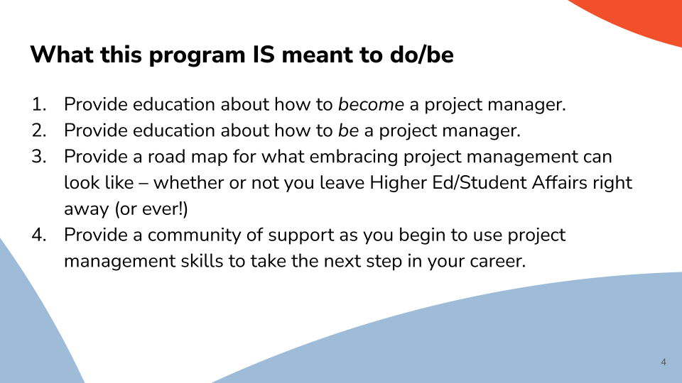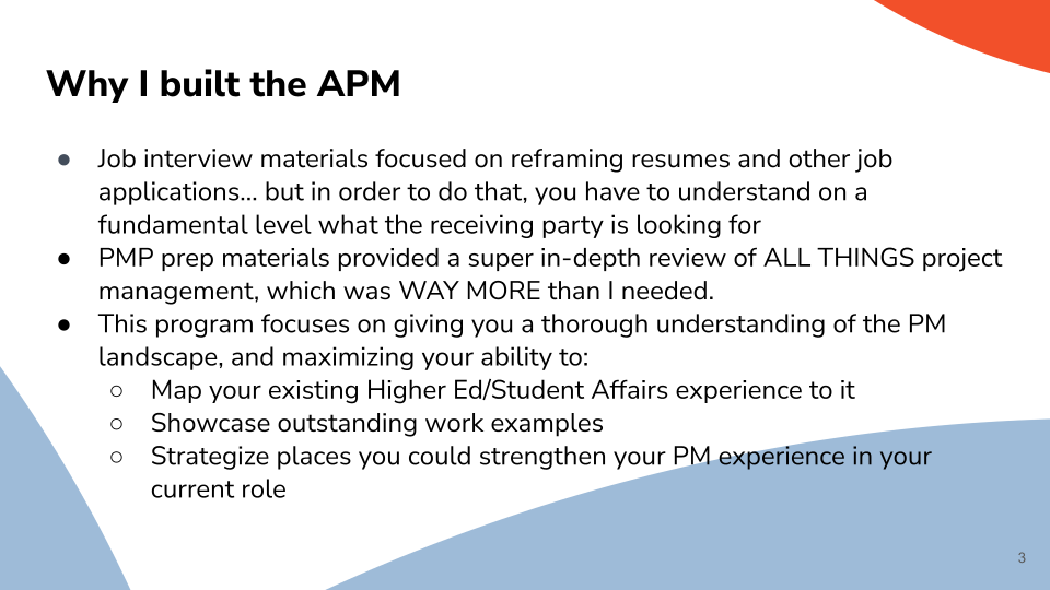 The Aspiring Project Manager, or the APM, is a forever-free overview of what it can look like to build your skills and your project management competency while working in helping professions (like higher ed, nonprofit, healthcare, and many others). Hear us when we say: your skills are powerful and important. We want to encourage you to strengthen your competency to keep leading meaningful work, and we know project management skills can help you do that.